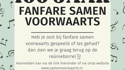 Was jij ooit lid van fanfare Samen Voorwaarts of heb je er muziekles gehad? Dan nodigen we je van harte uit voor onze reünie ter gelegenheid van het 100-jarig bestaan! 📅 Zaterdag 14 februari 2026 Tijdens de avond is er een donatiebox voor een vrijwillige bijdrage. Samen halen we herinneringen op en vieren we 100 jaar muziek en verbondenheid! Jij komt toch ook?